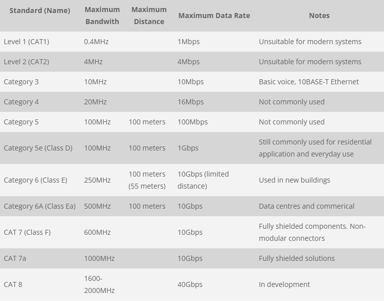 CAT6A is capable of supporting data transfer rates of up to 10Gbps at a maximum bandwidth of 500MHz. CAT6A has additional and tighter twists, with additional insulation to reduce crosstalk.