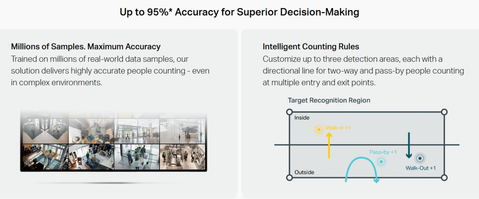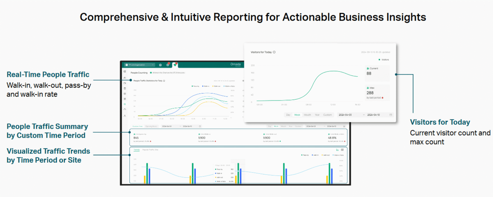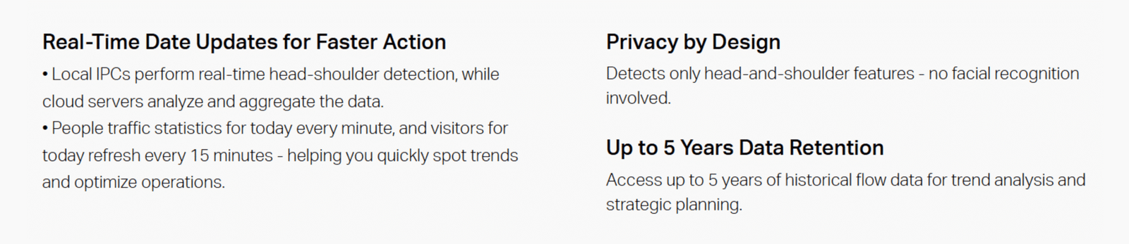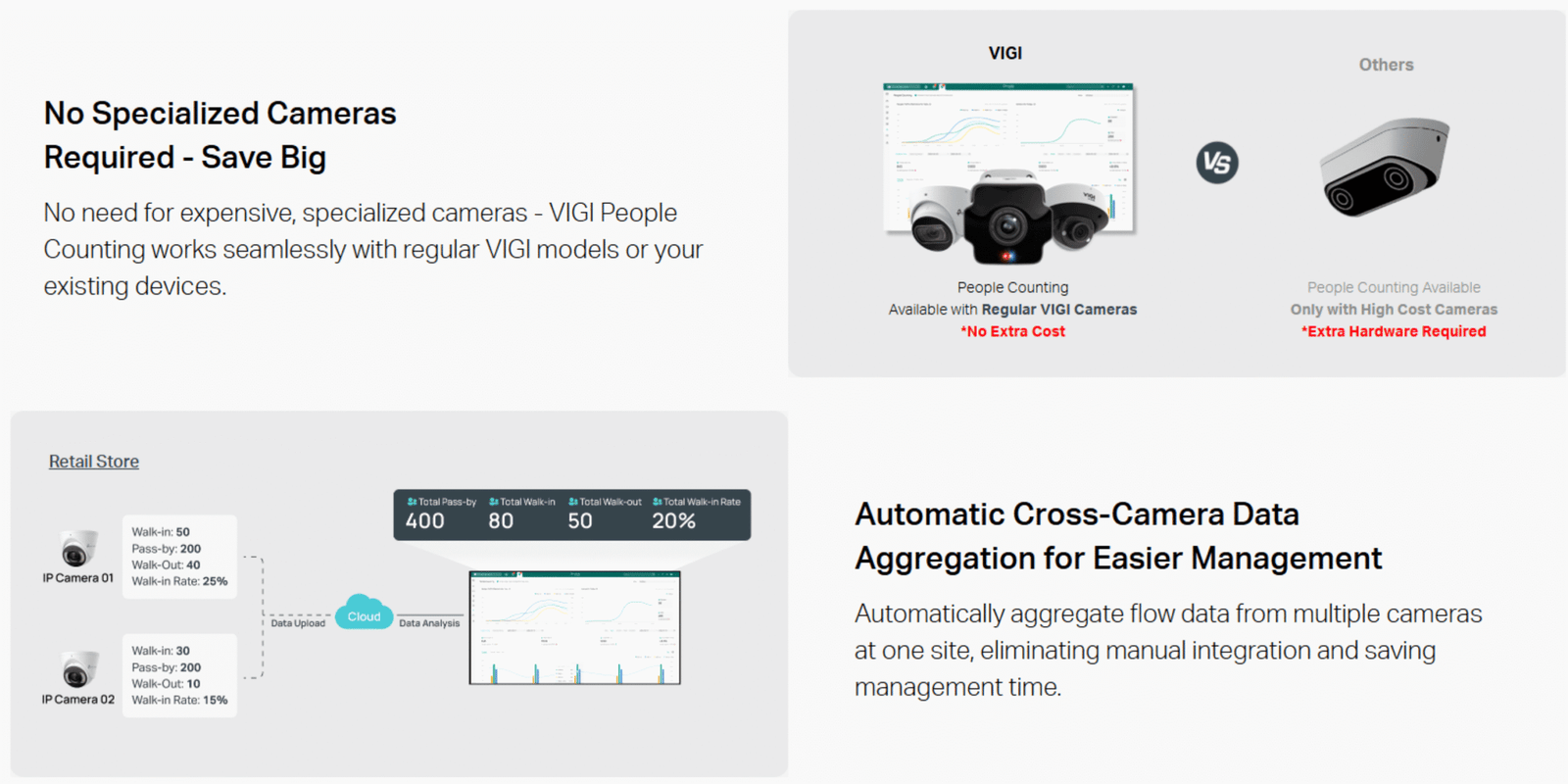 VIGI advanced people counting technology uses head-shoulder detection to accurately track entries, exits, and passersby. It provides real-time flow reports to support better decision-making. Ideal for entrances and exits in small retail stores, cafés, and more.