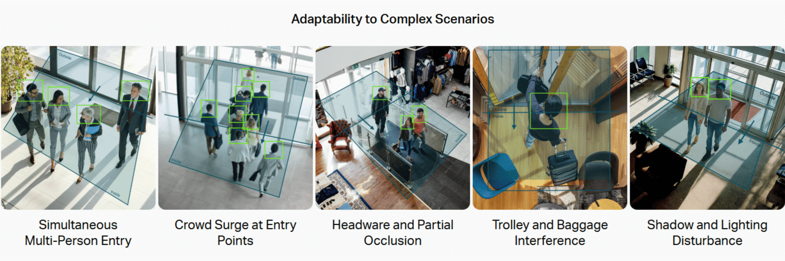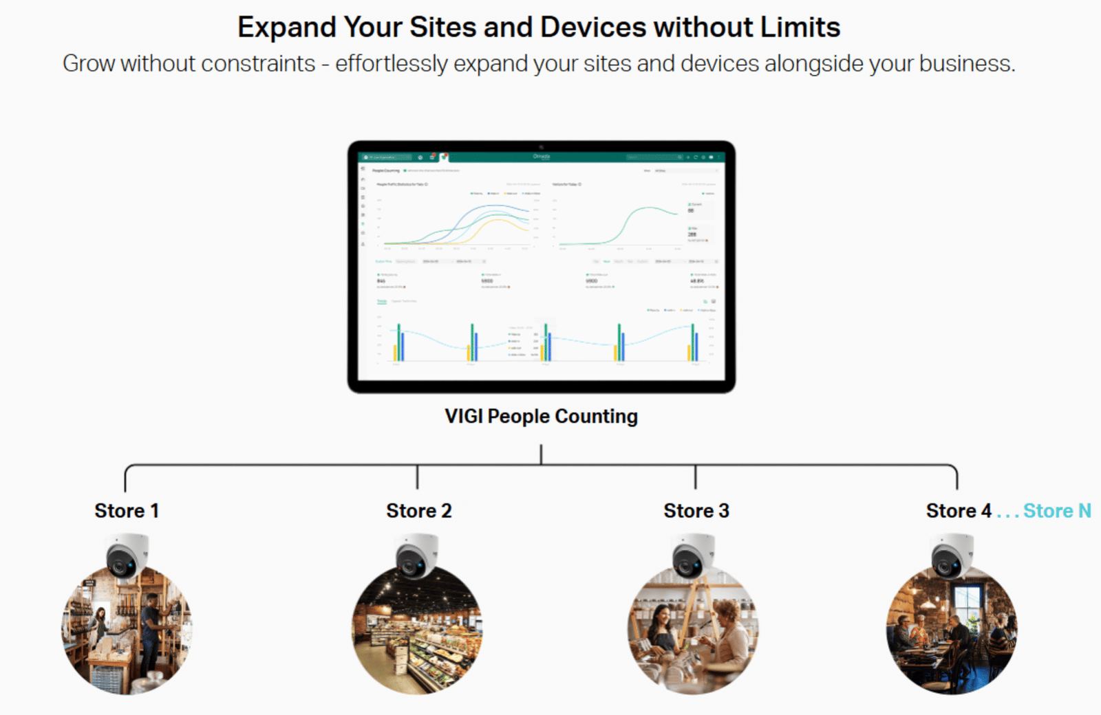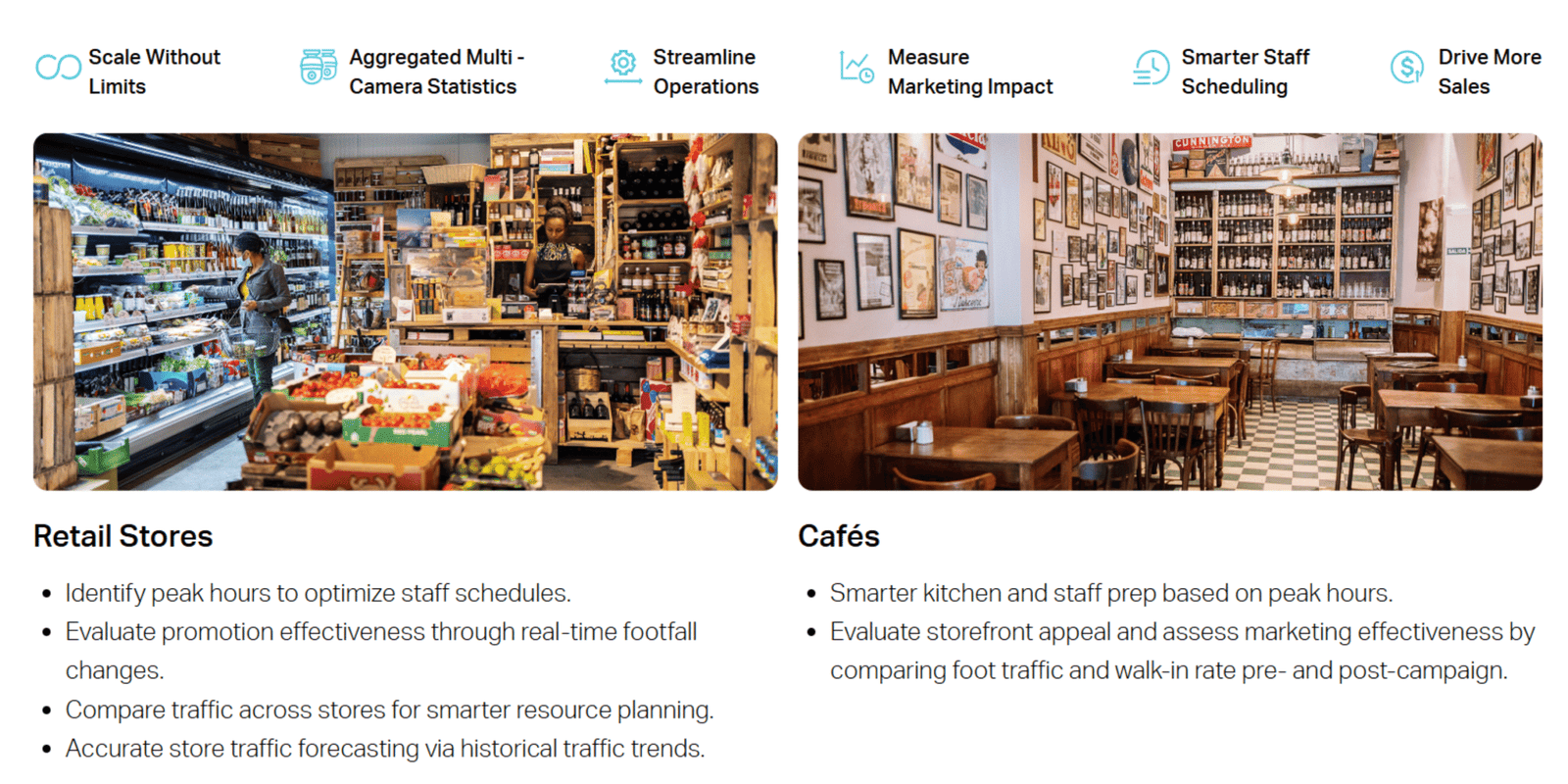VIGI advanced people counting technology uses head-shoulder detection to accurately track entries, exits, and passersby. It provides real-time flow reports to support better decision-making. Ideal for entrances and exits in small retail stores, cafés, and more.