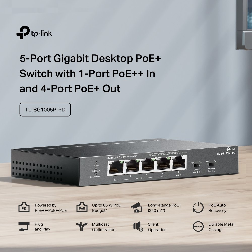 TP-Link TL-SG1005P-PD Gigabit PoE-Powered Unmanaged Network PoE Switch With 1 * PoE++ Input Port + 4 * 10/100/1000Mbps PoE Output Ports – Up To 66W PoE Power Output