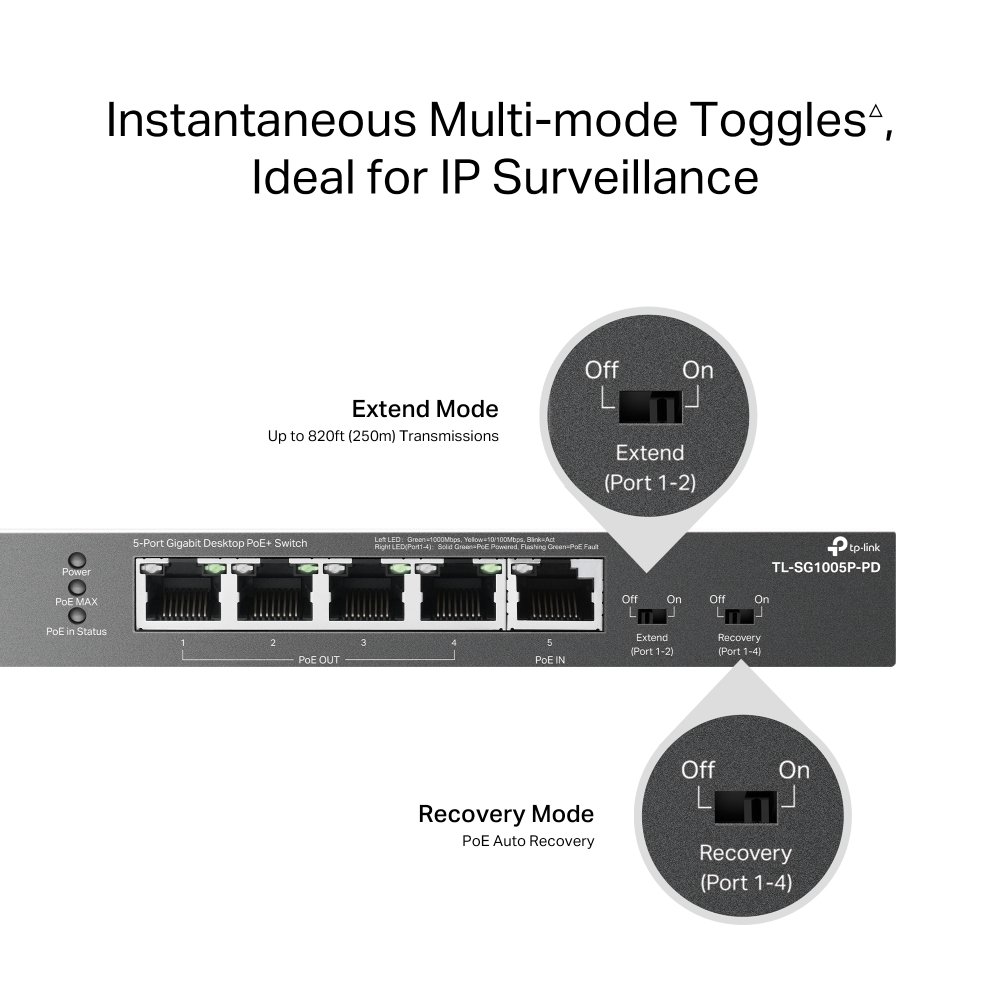 - Long-Range PoE+: With Extend Mode**, PoE transmission distance reaches up to 250 m, perfect for surveillance camera deployment in large areas.